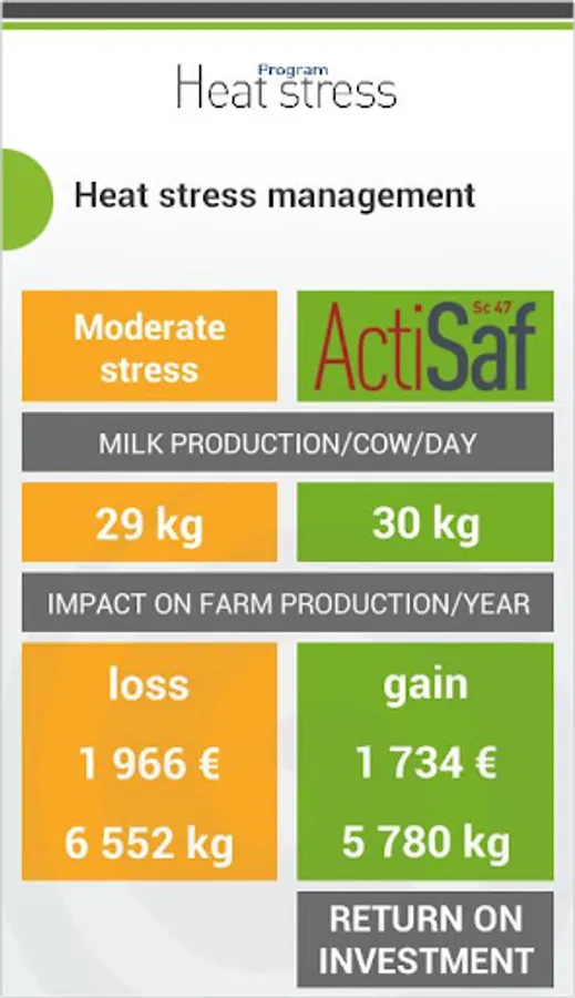This user-friendly tool will allow you to assess the level of heat stress on the farm by calculating the temperature humidity index and the impact of heat stress on physiology and performances of dairy cows. The return on investment of an optimal management with the addition of the live yeast Actisaf® in the feed of cows is calculated based on each farm size and characteristics for a complete tailor made analysis.