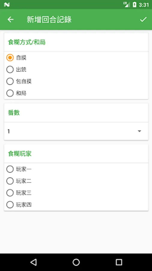 只需選擇食糊人,自摸/出銃/包自摸/和局,番數,程式即可按照計番表自動計算和記下輸贏金額,輸贏一目了然。