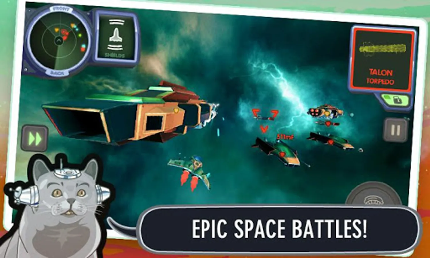 "Ace Ferrara And The Dino Menace"'s gameplay has been carefully designed to feel great on your touchscreen! Steering is restricted to left/right, but barrel rolling and other maneuvers more than make up for the missing degrees of freedom: Hit the afterburner to get close to your enemy, circle around them, guns blazing, or take them out with your missiles, all while keeping a close eye on your ship's different shield quadrants!