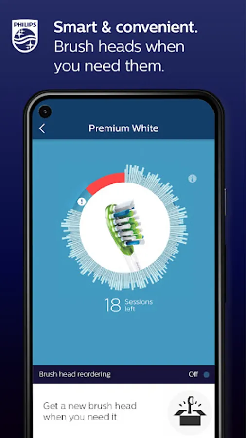 Always have a fresh brush head when you need one. As the Sonicare app monitors your brush head’s usage, the reordering service reminds you when you need a replacement, and can automatically place an order so it arrives just in time. The brush head smart reordering service is available in the United States, United Kingdom, Germany, France, Spain, Italy and Japan.