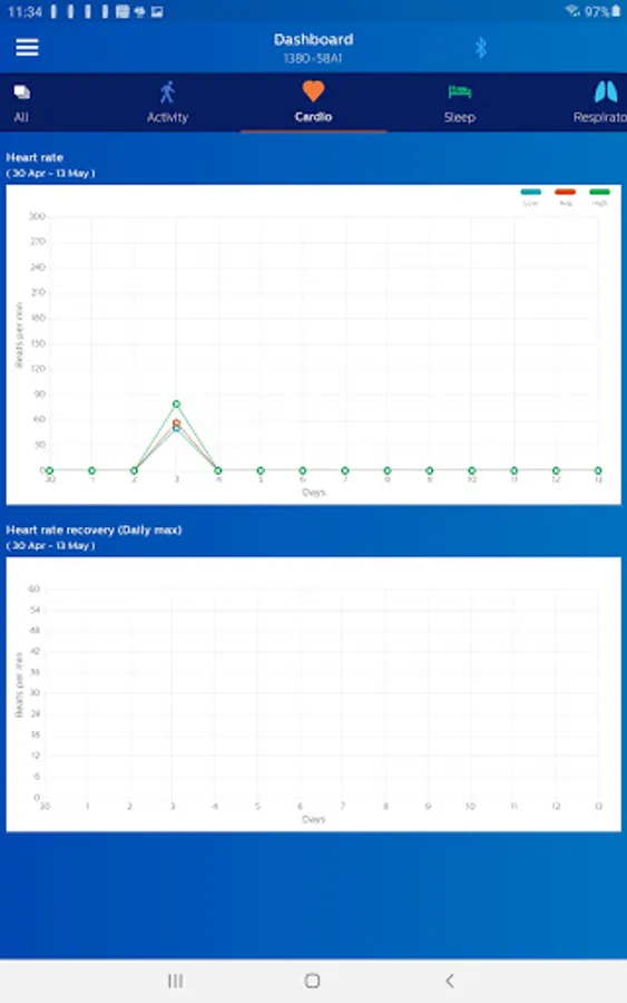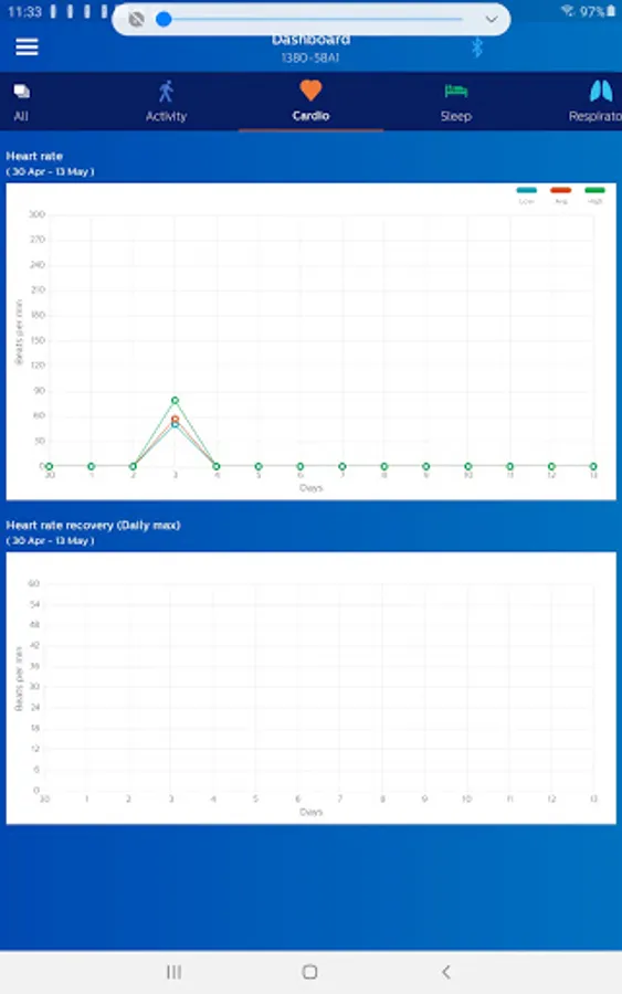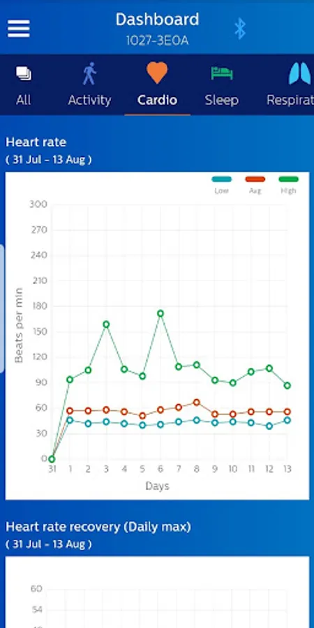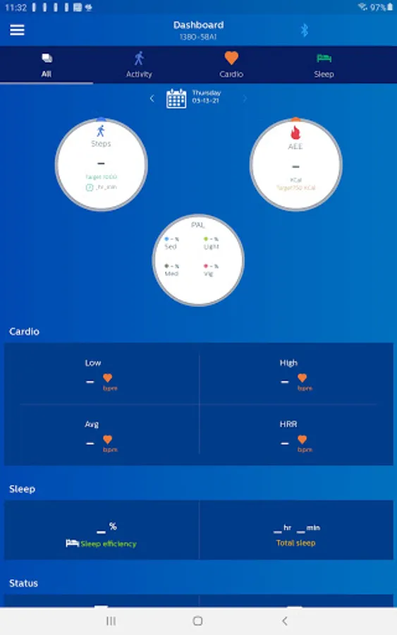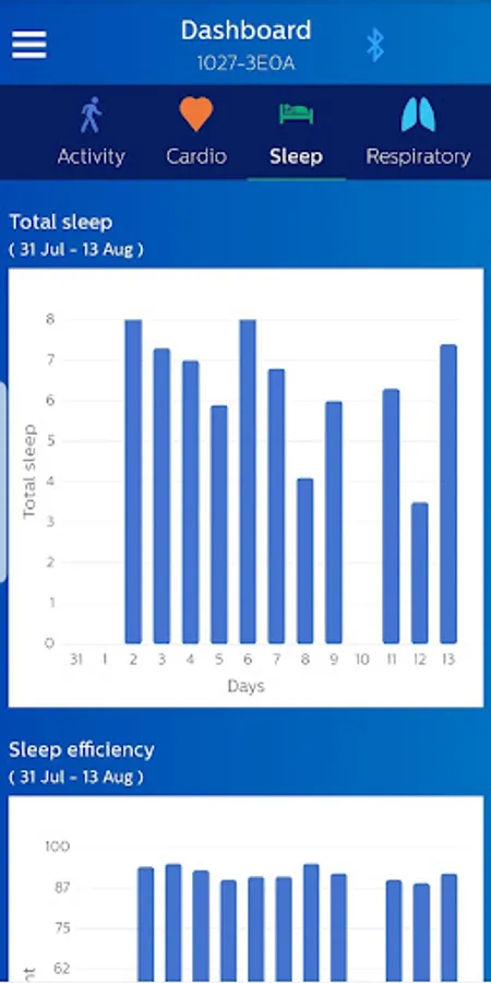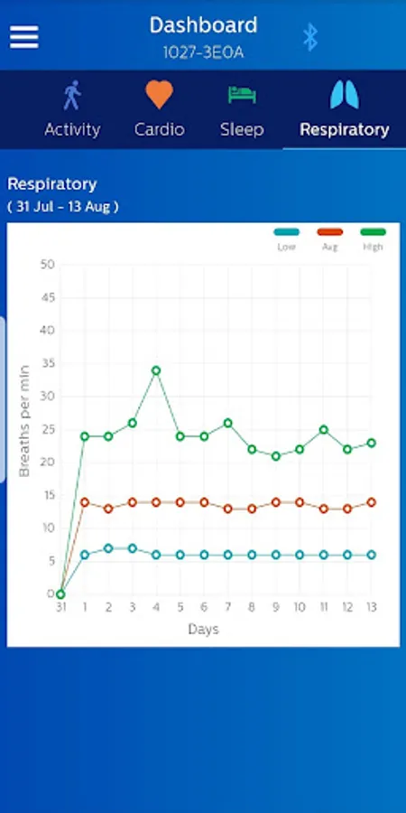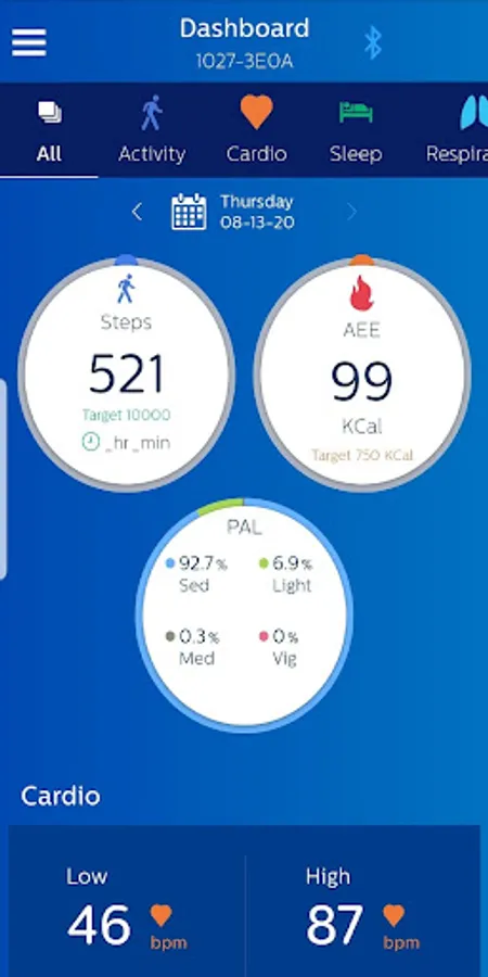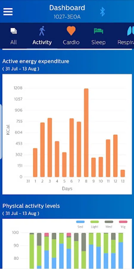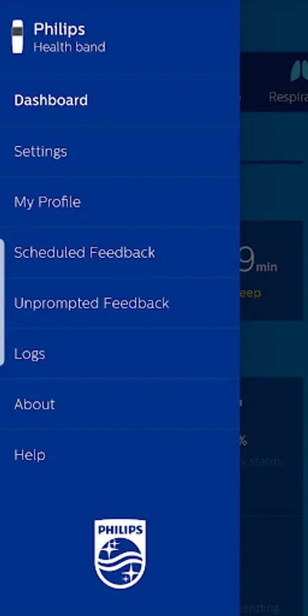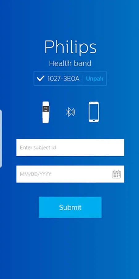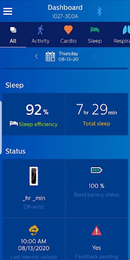 The Philips Health band (PHB) mobile application displays Bluetooth data acquisition from the PHB wrist-worn wearable medical device. Data includes energy expenditure, heart rate, respiratory rate, and sleep metrics. Patients wearing the device may provide feedback through the application’s patient reported outcomes (PRO) feature.