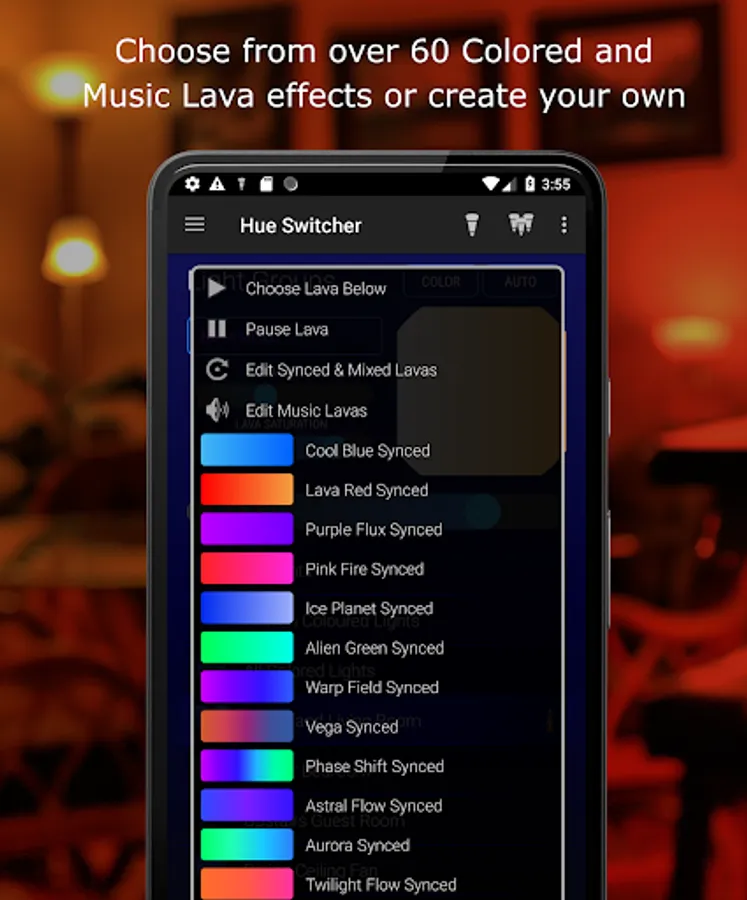 WARNING:Hue Switcher contains many dynamic lighting effects! Some Lavas* contain rapid bursts of light, please use at your own risk! See Disclaimer below.