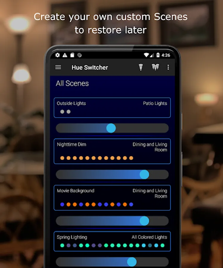 • Save Scenes to sliding bars that can be assigned to different Rooms in your home.