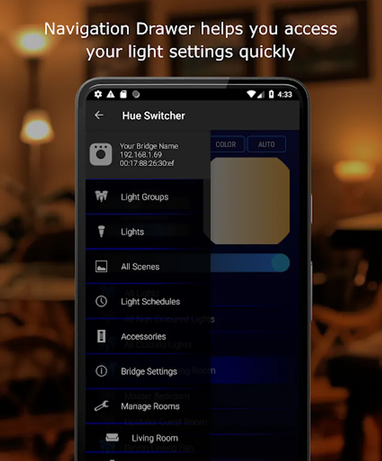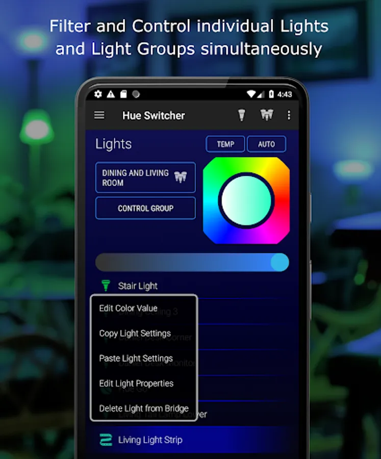 Hue Switcher is a third party application designed to enable fun and advanced control of your Philips Hue Bridge Lighting System.