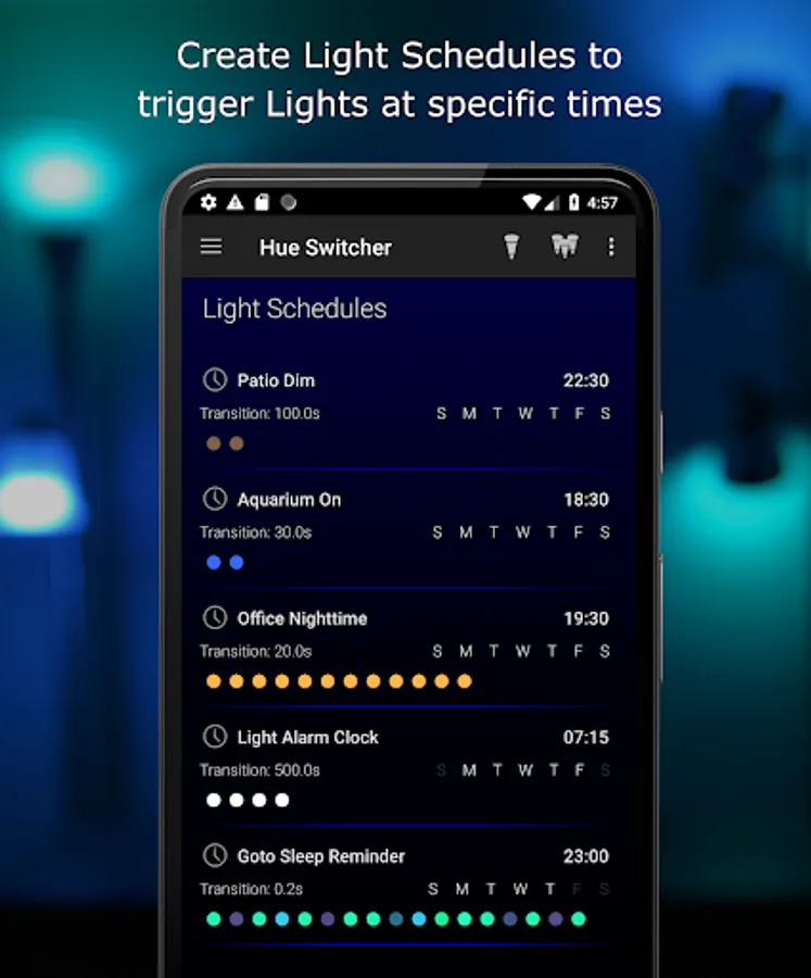 • Create Light Schedules to trigger Scenes at certain times of the day, recurring on all or certain days of the week.