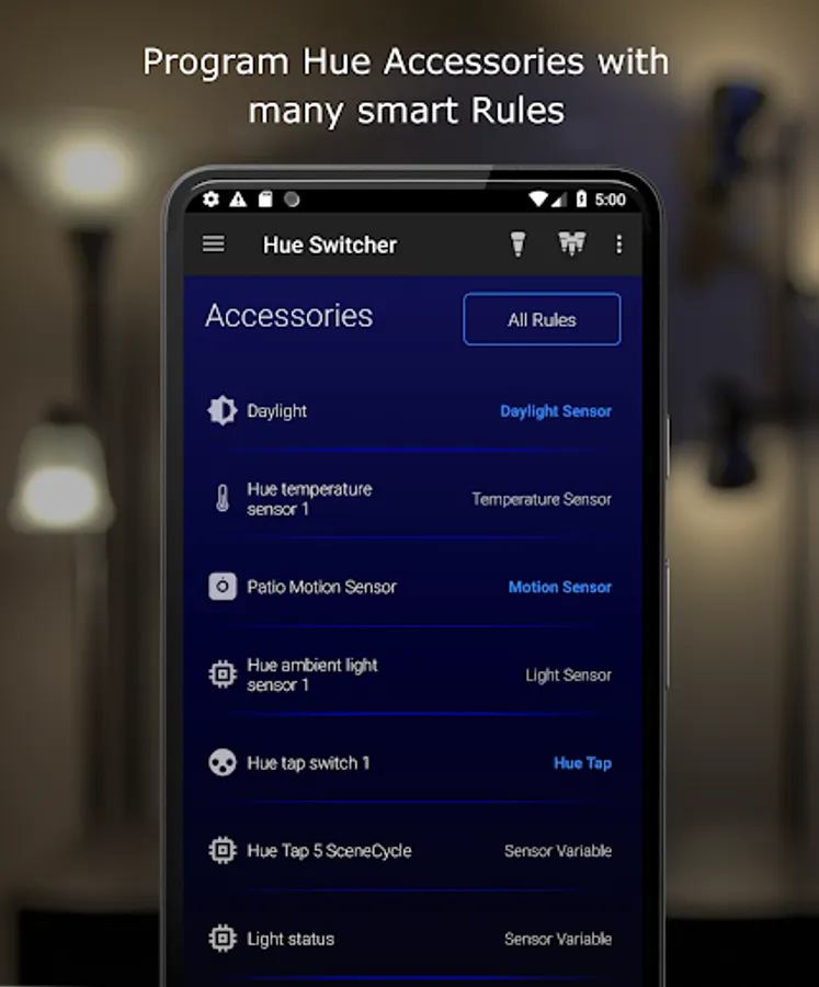 • Create trigger events using many different options for Hue accessories such as the Hue Tap, Dimmer Switch, and Motion Sensor.