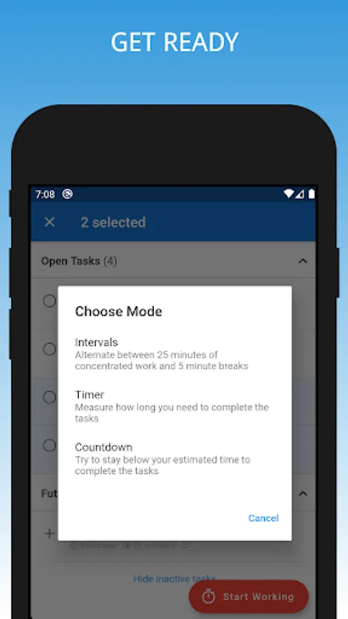 Countdown: Try to stay below your estimated time to complete the selected tasks.