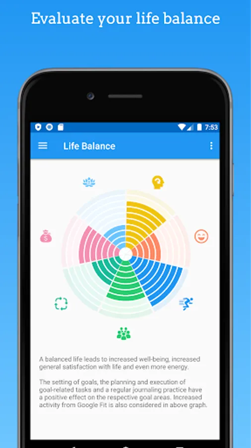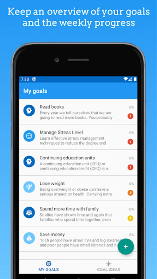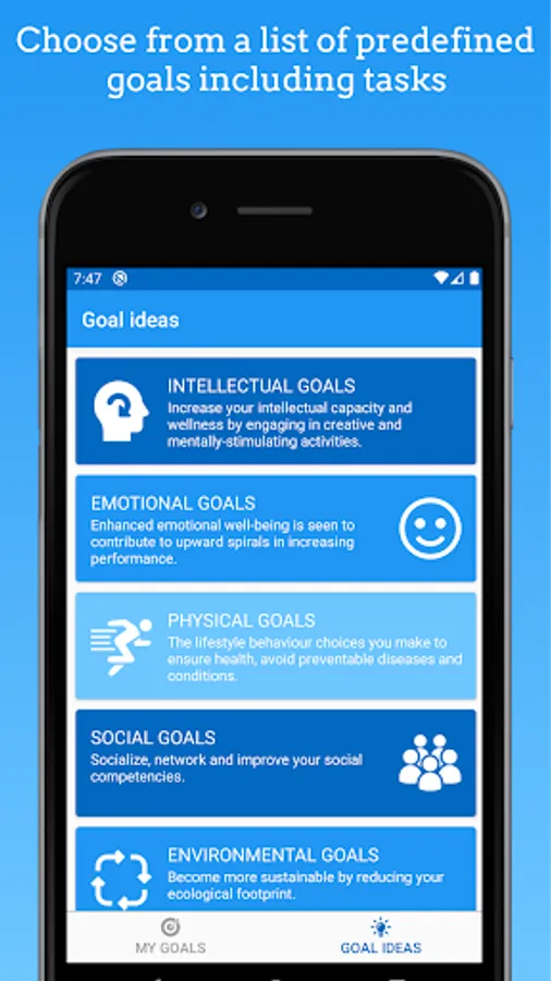 ✔ Various predefined goals like lose weight, save money, improve self control, drink more water, increase mental strength, spend more time with family, get more grit, buy a house or become a better friend