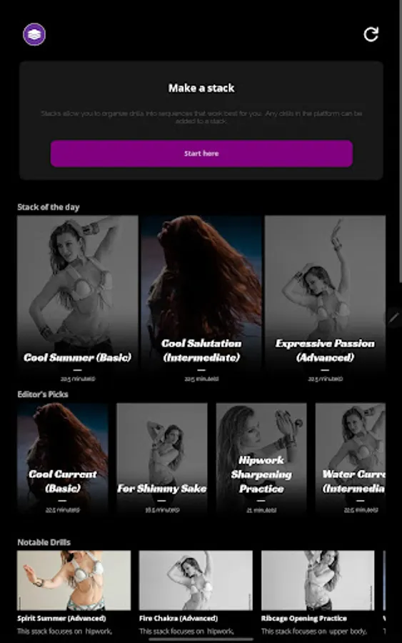 In addition to creating your own customized playlists, Belllydance Stackable Drills features lots of premade practice playlists of varying levels, technique focuses, and lengths of time. An especially exciting feature to keep you looking forward to your practice as well as progressing in it is our featured Daily Drill- a new one each day for each level!
