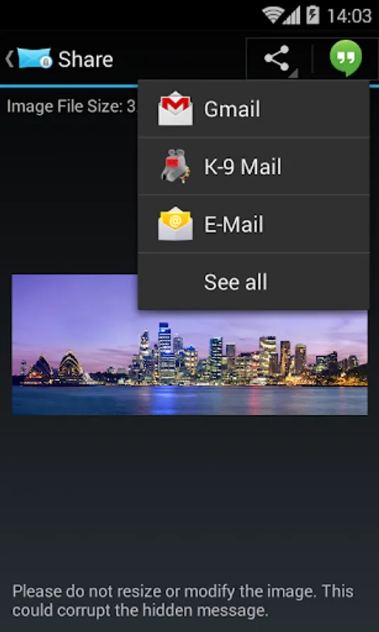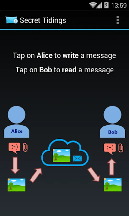 This application hides messages in plain images. The images can be shared by email or social media. No one but the receiver will be able to read the message.