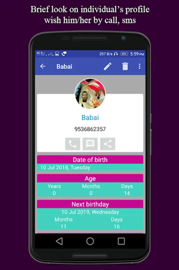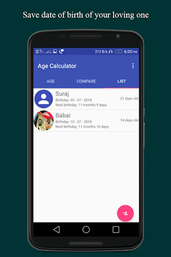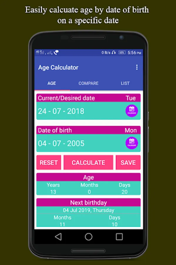 Age Calculator is an application having the facilities of calculating age according to birthday or a specific day, compare age between two persons with their birthday or actual age. It will show you your horoscope when you enter your birthday to calculate your age. Also you can save birthdays of your loving one and it will remind you on their birthdays.