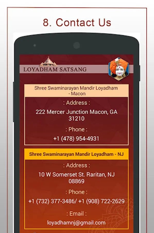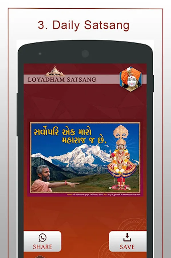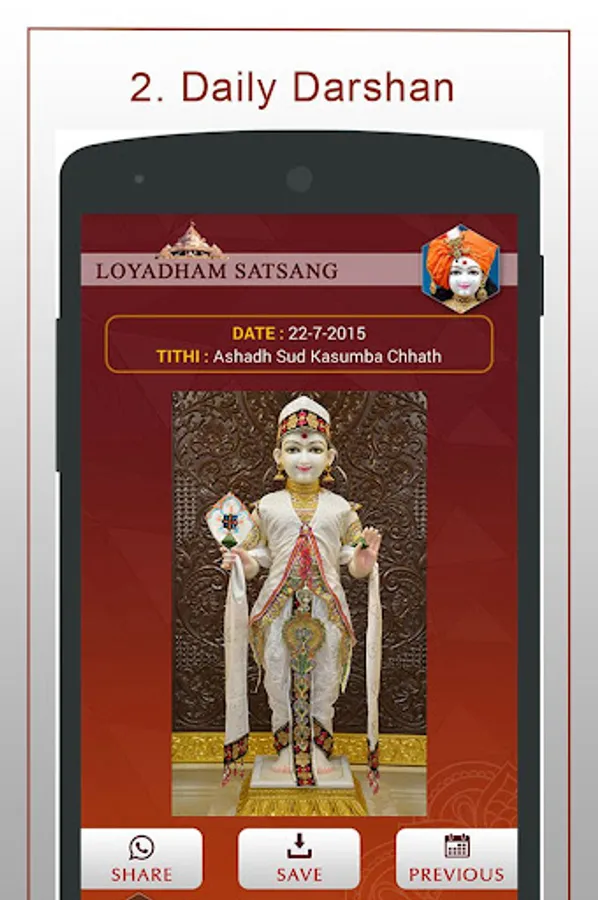 1) DAILY DARSHAN : Devotee will be able to view the daily darshan image of Lord Swaminarayan. Devotee can download images as well as share it on any social media sites.Also they can see previous darsahn images.