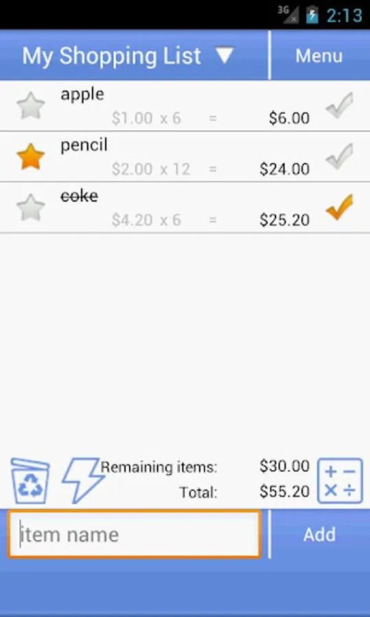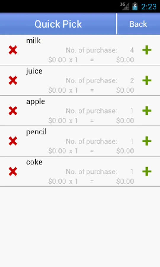 This app will record bought items automatically. When user wants to add items ever purchased, go to "Quick Pick" and add the item to list by just one click.