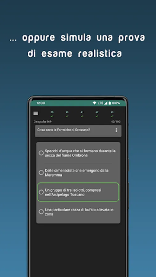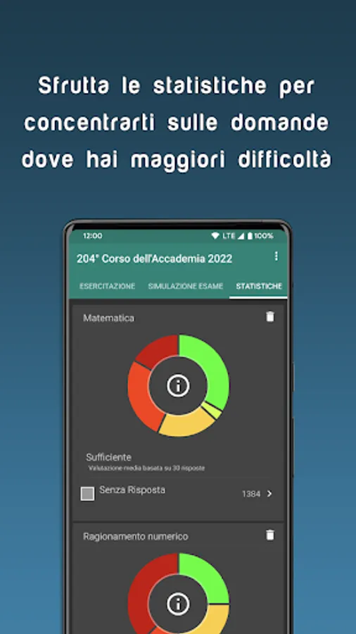 In the section dedicated to statistics it is possible to have an evaluation for each subject, to filter the questions according to the level of knowledge; moreover, it is possible to repeat the questions, individually or as a whole, in which you have greater difficulties.