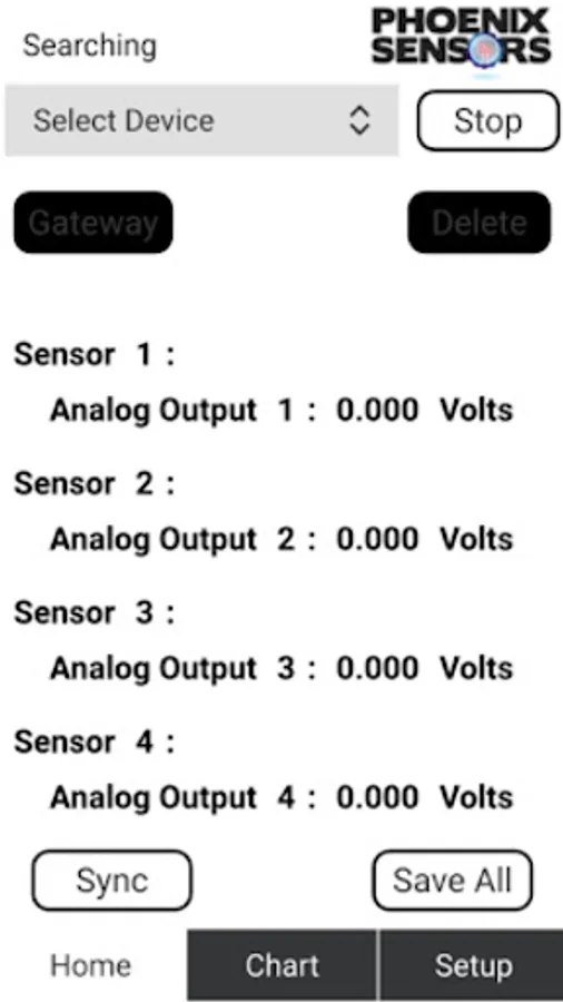 Connect up to 4 Sensors to Phoenix Sensors' Analog Gateways and setup, view and save data. Option to save data directly to mobile device, or view it live with the Chart!