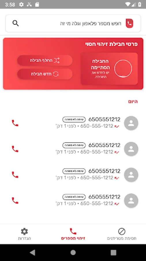 From now on you will know who bothers you even from a privileged number !! With the application for the confidential identification of the center of the lines, you can identify any blocked number calling you, and see its real number, whether it is a friend, relative, or just disturbing or spam. From today - there are no surprises anymore ..