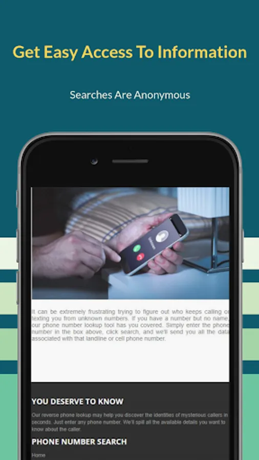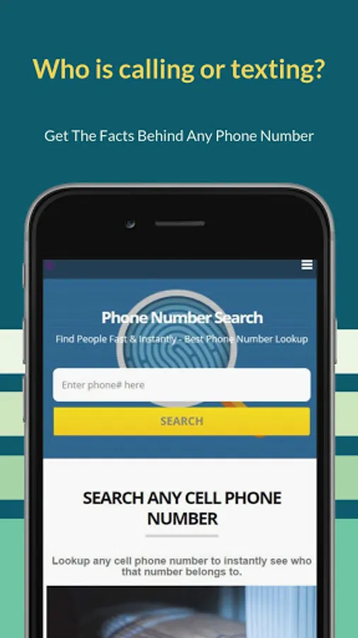 Phone Number Search makes it quick and easy to uncover data on any cellphone or landline phone number with a few taps of the screen. Our database searches billions of numbers and provides you instant results. Never wonder who is calling again with our new free app. We provide a free Phone Number Search that lets you search database containing records for the phone number you searched. Once a match is found you will have the option to order a report.