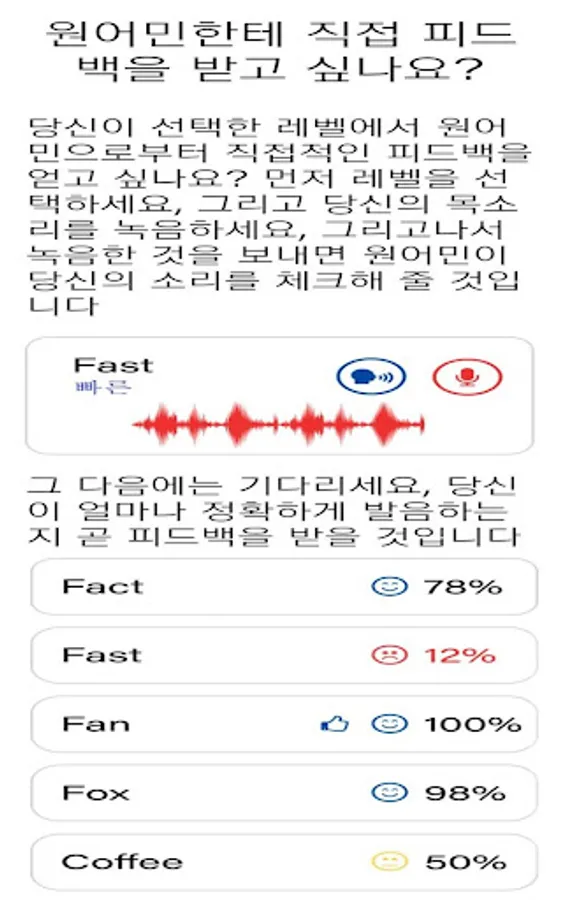 Phone-etics is an English pronunciation app to help native Korean speakers with their phonics. The phone records the user's voice and gives feedback to the user if it is pronounced correctly or not. The user can record a set of words to have a native speaker verify accuracy.