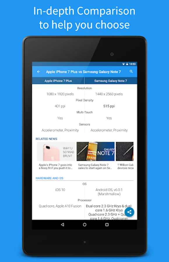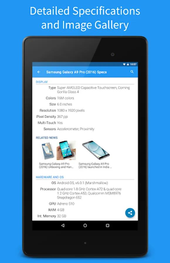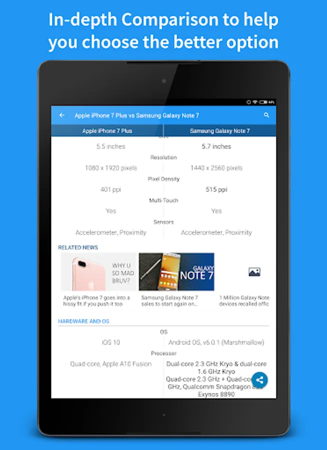 - Detailed Specifications: You can see all phones made by a particular manufacturer here like Samsung, Xiaomi, Apple, Lenovo, Leeco, LG. Find all the hardware details about smartphone from their 3G/4G band support, VoLTE, USB OTG, display resolution, processor, GPU, sensors, camera resolution and everything else in between.