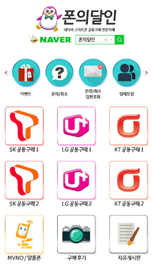 ‘네이버 스마트폰 공동구매 전문카페’라는 슬로건을 내걸고 국내 대형 공식대리점들이 입점해 최저가 정책을 지향하며, 판매 중입니다.
