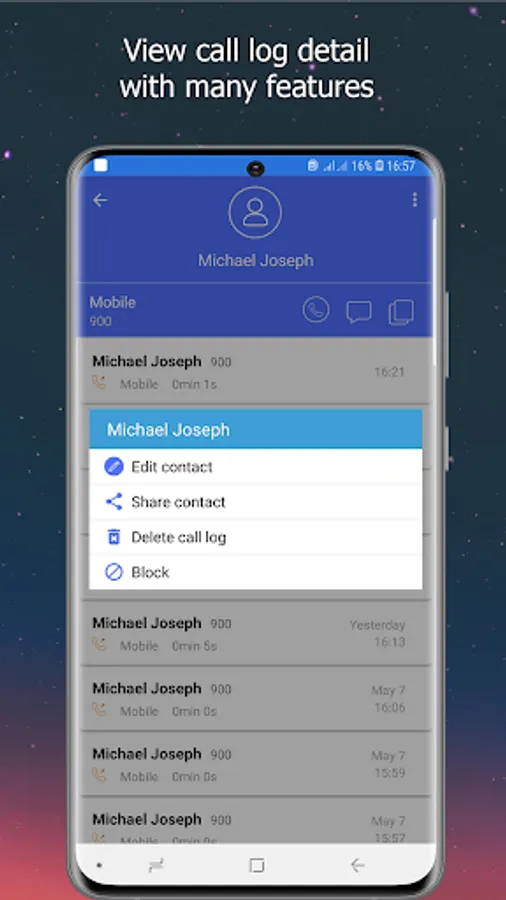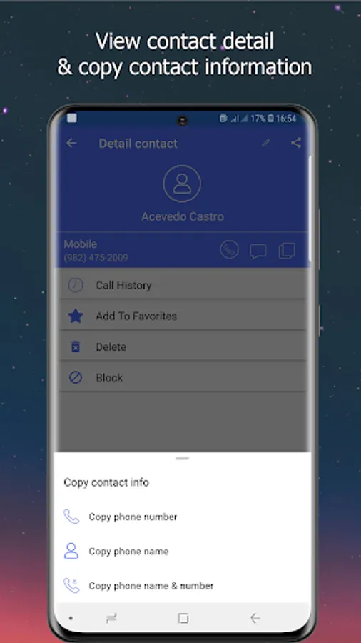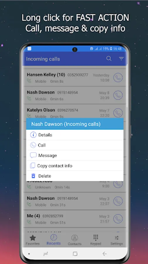 - LONG CLICK FOR FAST ACTION: copy contact information, copy phone number or phone name, call, message, block and unblock contact.
