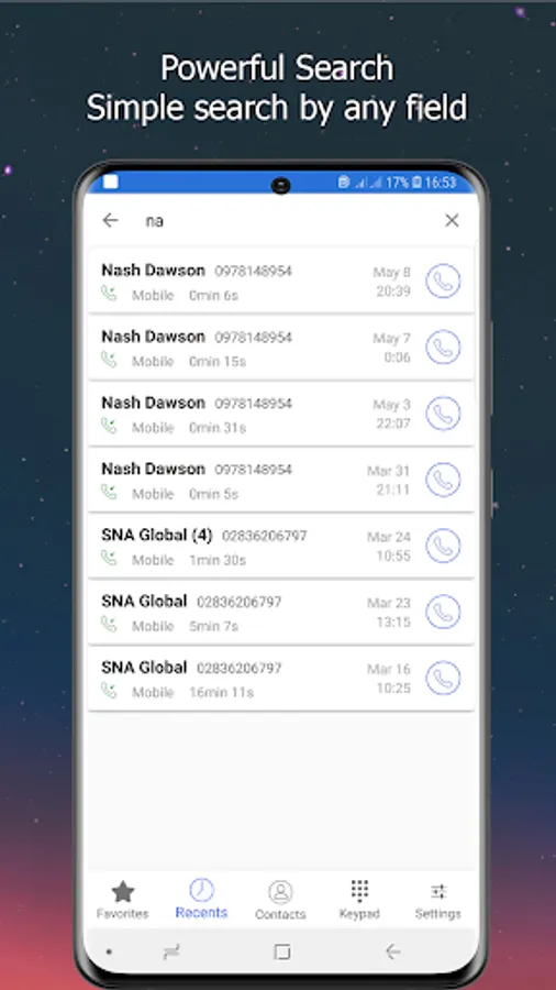 - Easy and quick contact search - Reach all your recent calls from the main screen. Search also through typing numbers in the dialer.