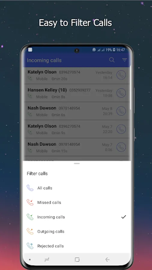 - Easy and quick filter calls: incoming calls, outgoing calls, rejected calls, missed calls, all calls.