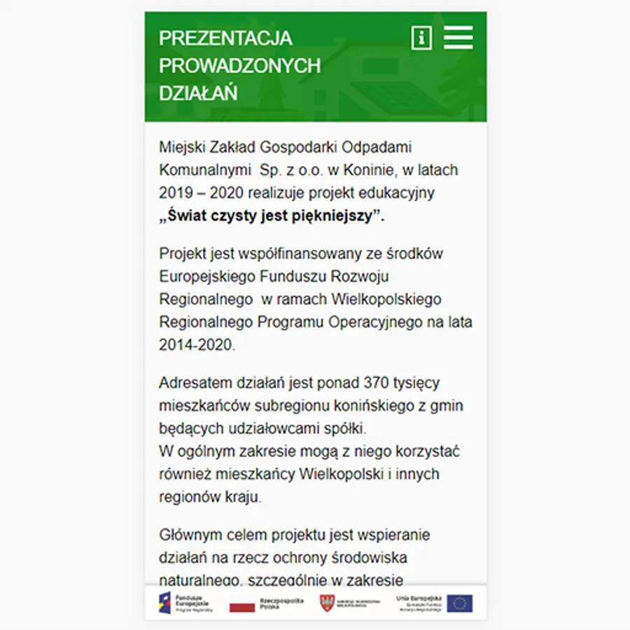 The application "Clean world is more beautiful" was prepared for the inhabitants of the Konin subregion. It provides information on selective waste collection and is an educational function.