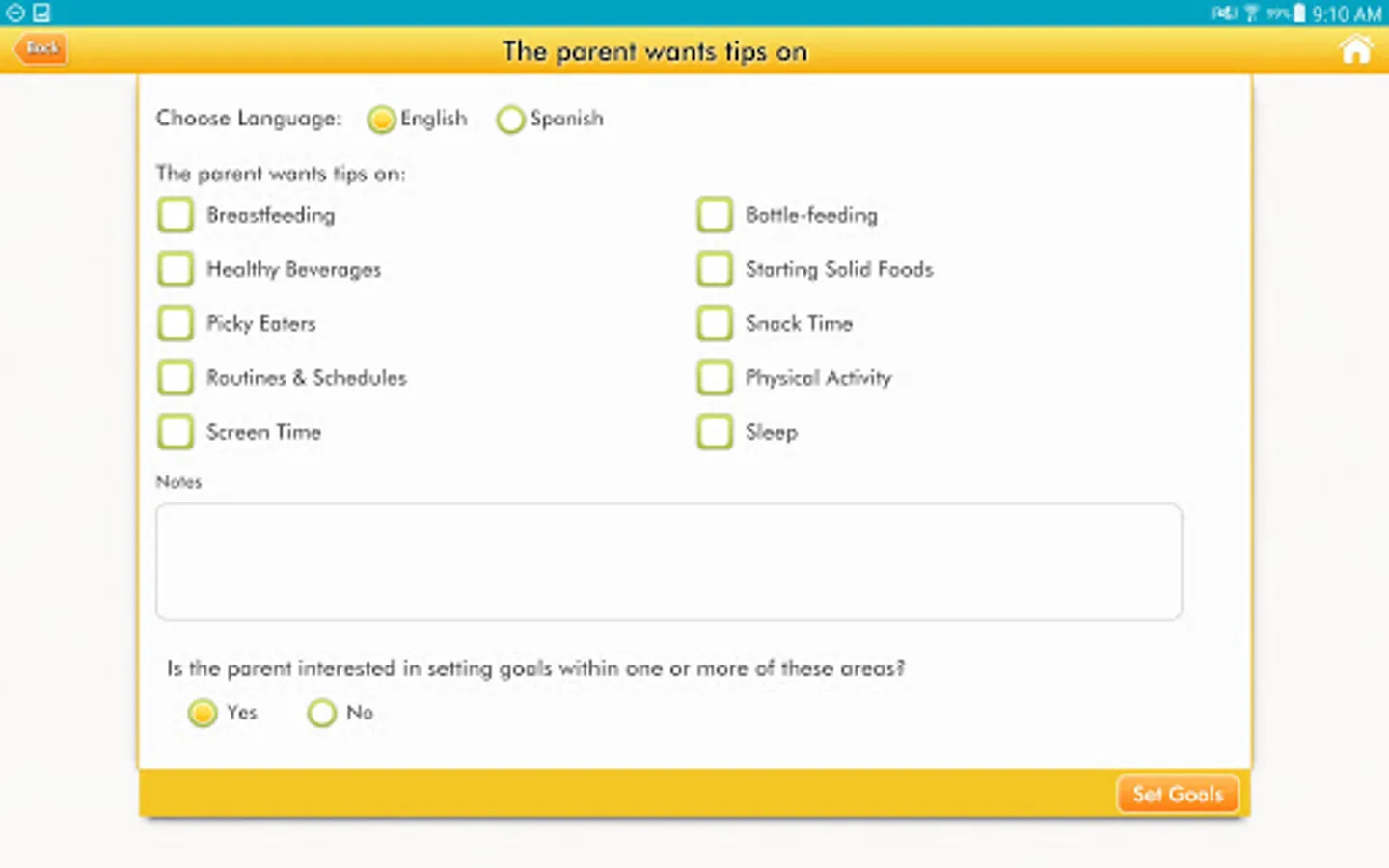 As a healthcare provider, this app allows you and the parent to identify healthy active living topic areas that are important to the family during a patient encounter. Also included is the option to add goal setting to motivate older children to strive for 5 servings of fruits and vegetables, 2 hours of screen time or less, 1 hour of physical activity or more, and 0 sugary beverages. The resulting personalized action strategies can be printed or emailed directly to the parent.