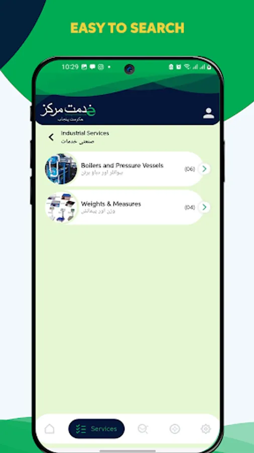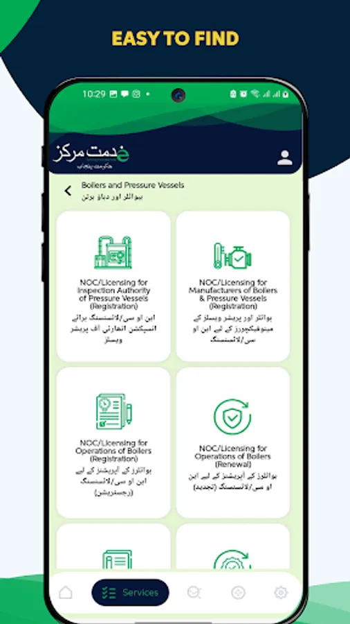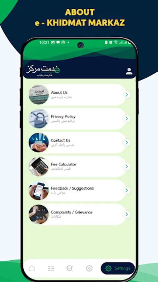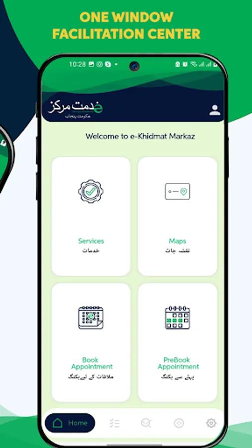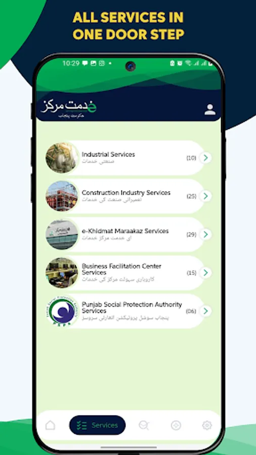 e-Khidmat mobile app concepts to integrate governmental services under one roof for citizens, easing Citizens vs. Governmental inter-phase. These services include the issuance of Warehouses Construction Permit (Lahore), Construction Services, and many other services like Birth Certificate, Character Certificate, Death Certificate, Marriage Certificate, Divorce Certificate, Domicile Certificate, Token Tax, CNIC, Issuance of Fard, Motor Vehicle Registration, Vehicle Transfer Ownership, Route Permit, Learners Driving License, Nadra e-Sahulat, and Traffic Fine Collection.