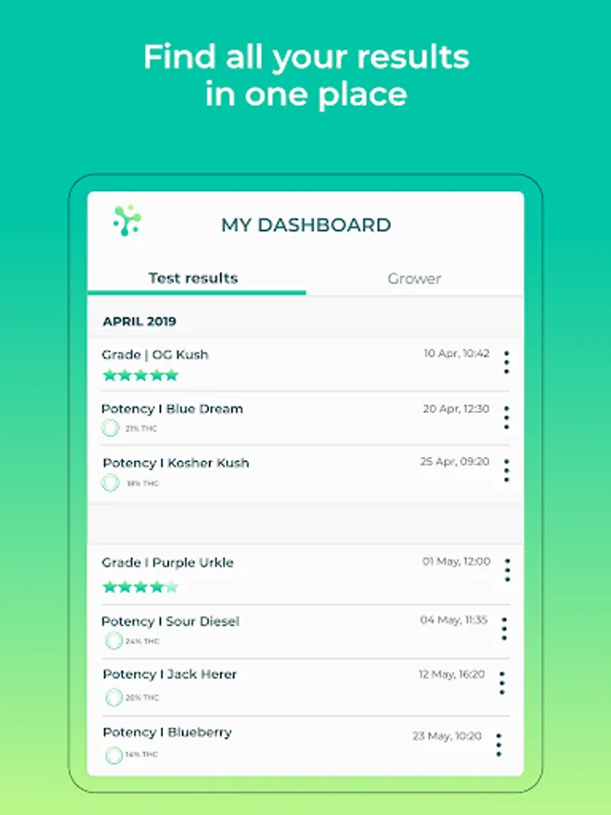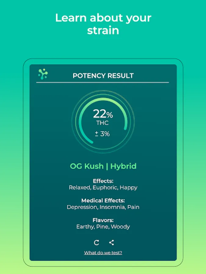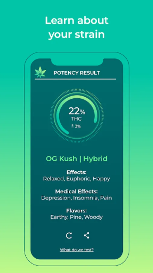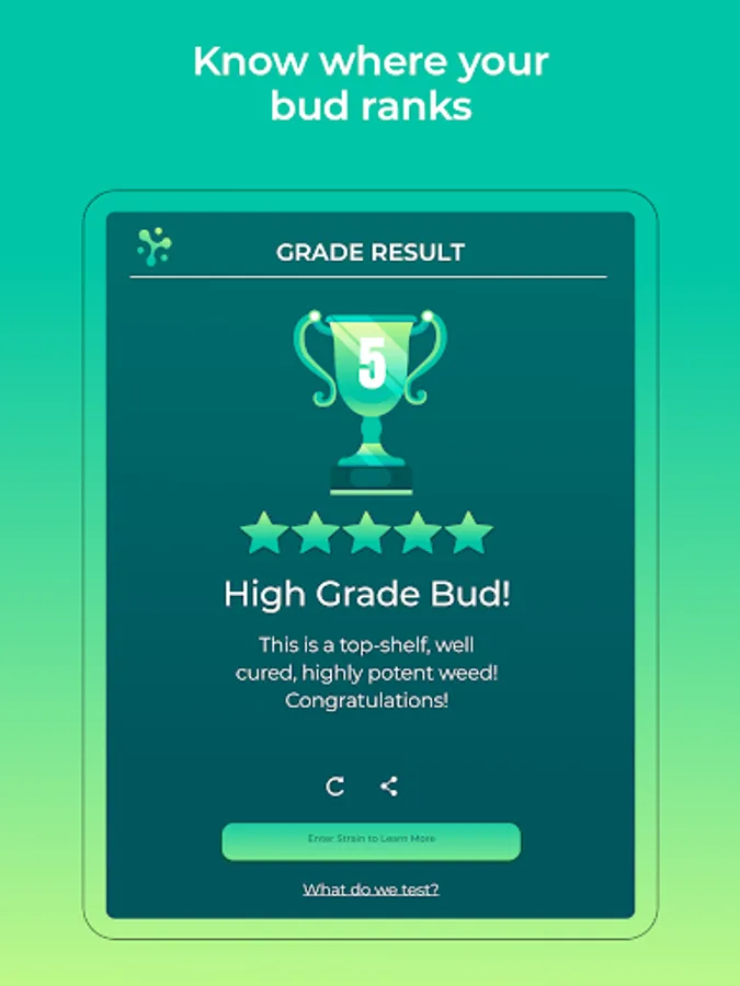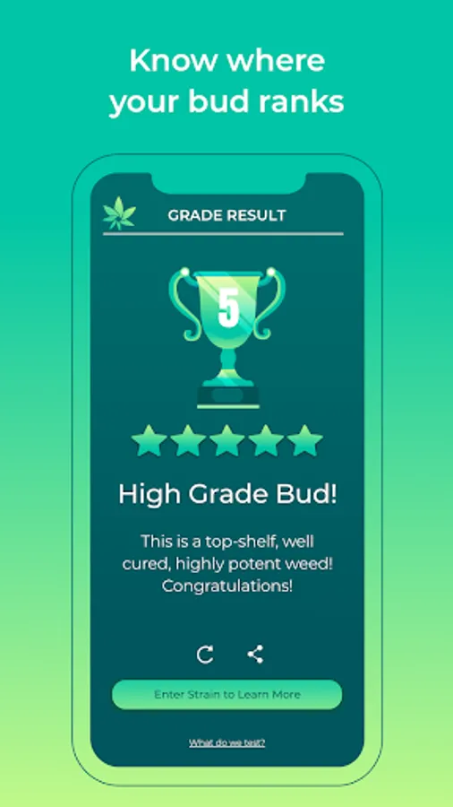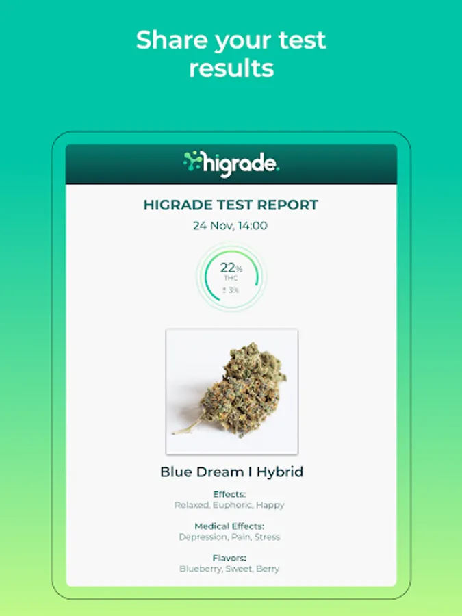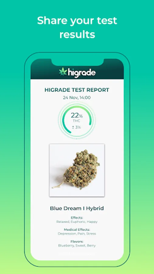 Instantly test the quality of your cannabis flowers straight from your phone. Three photos are all you need to get a real insight into the health and quality of your bud. No lab equipment is necessary! Analyze your plant’s quality and %THC by harnessing the power of artificial intelligence and HiGrade’s proprietary testing algorithms. Turn your camera phone into an accurate, portable testing station so you can better understand the product in front of you.