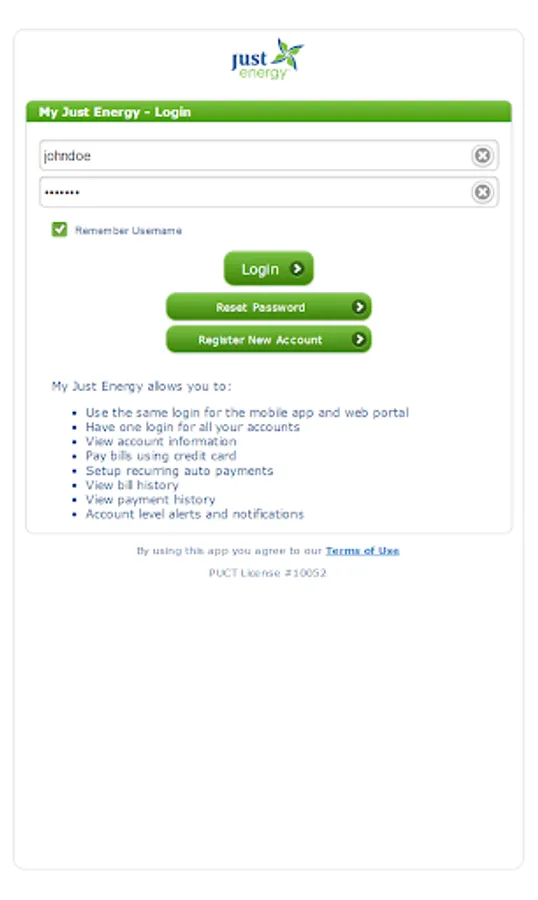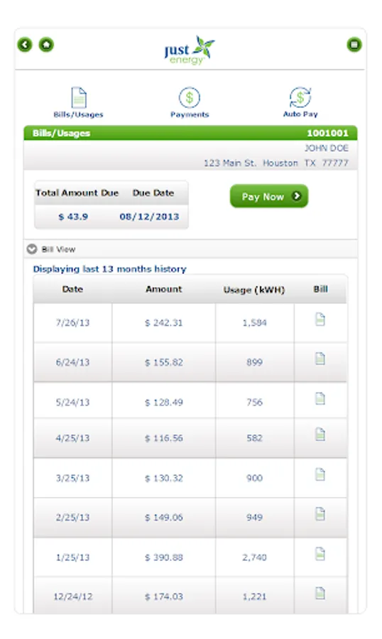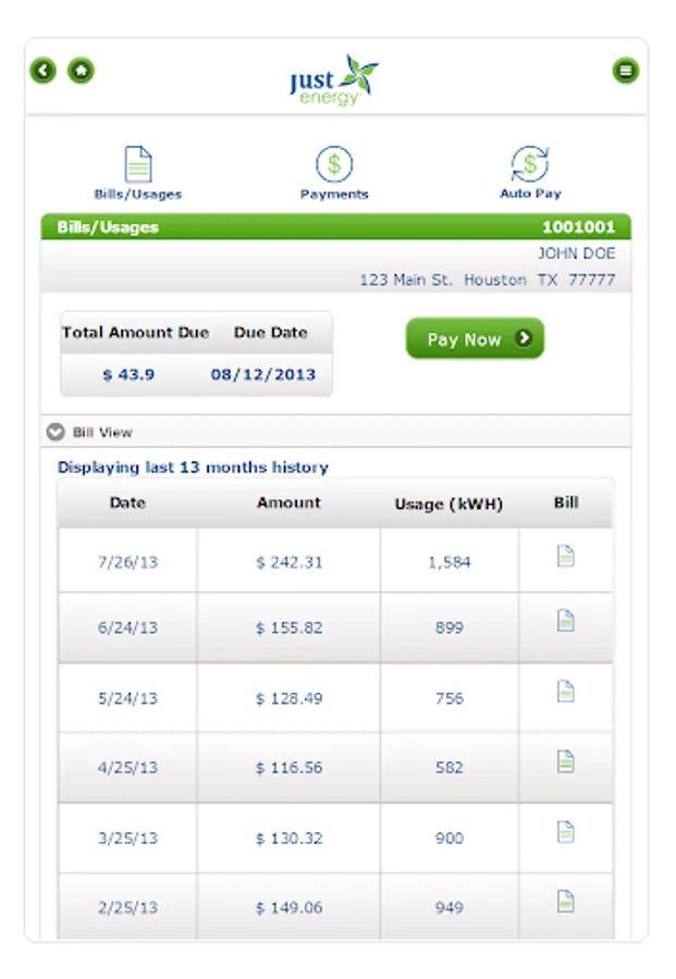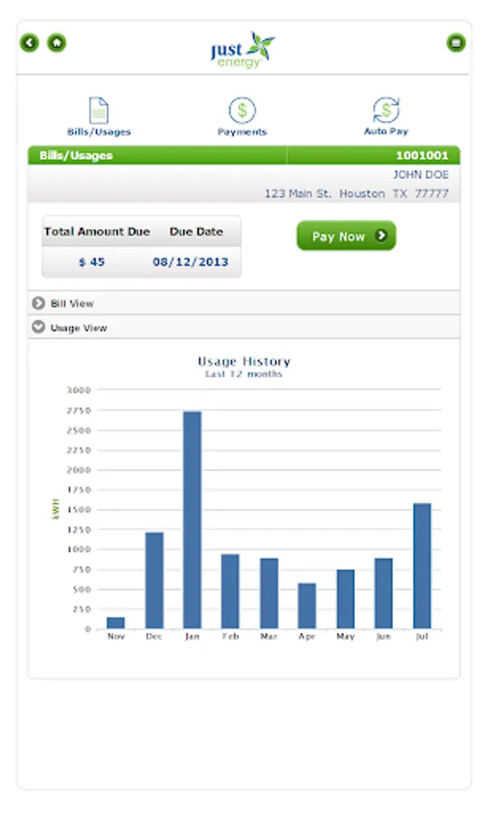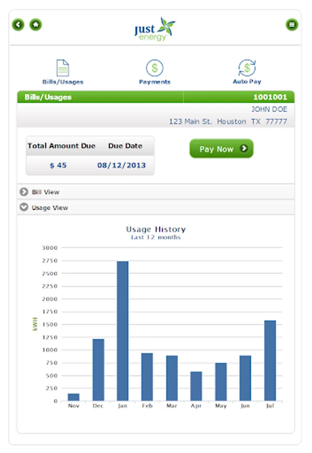 My Just Energy app offers access to view/pay bills, monthly usage & payment history through your phone or tablet device. To get started, download the app and sign in with your "My Just Energy" username and password.