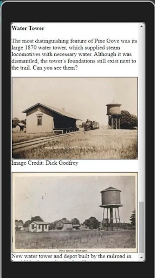 This app describes the history of Michigan's Kal-Haven Heritage Trail. It includes a map of the trail with links to photographs and histories of various points along the rail trail from Kalamazoo to South Haven.