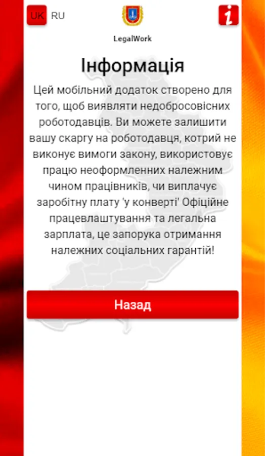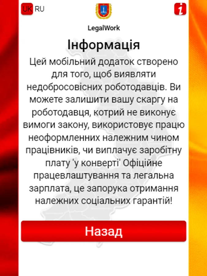 This mobile app is to identify unscrupulous employers. You can leave your complaint narobotodavtsya, which does not comply with legal requirements, uses work properly neoformlennyh workers or pay wages 'envelope' official legal employment and wages, is the key to getting nalezhnyhsotsialnyh guarantee!