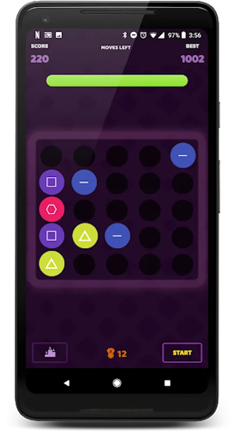 When two tiles with the same shape or colour merge, they make a different shape! The more the number or lines in the shape you make the more your points. Merge 10 tiles in a row - horizontally, vertically, or both - to grab a bonus move and unlock the power mode!