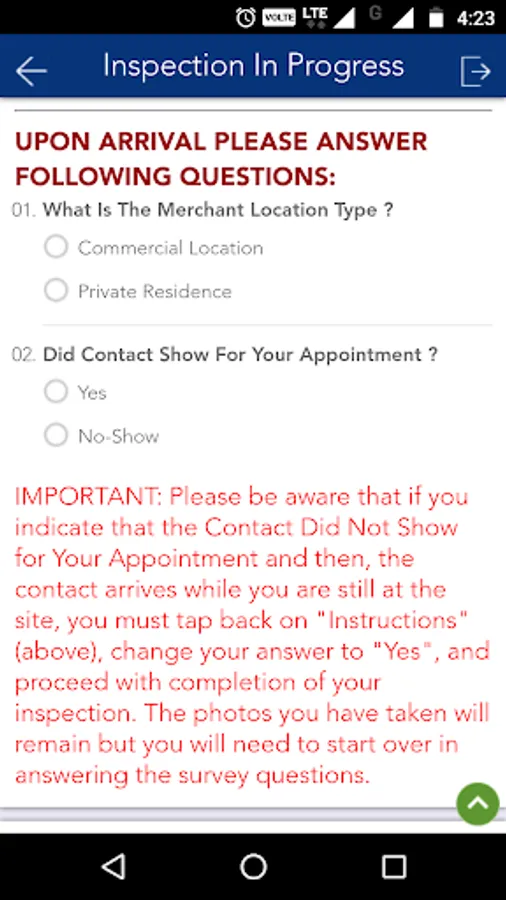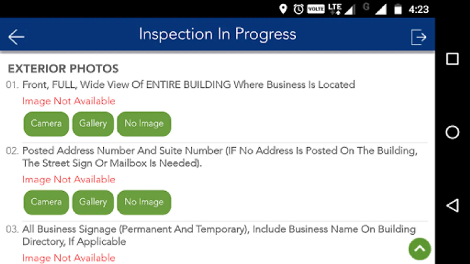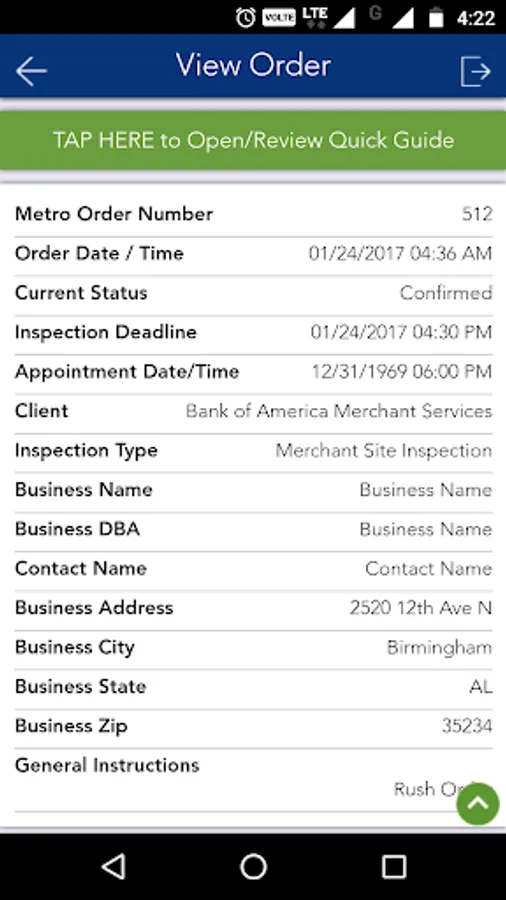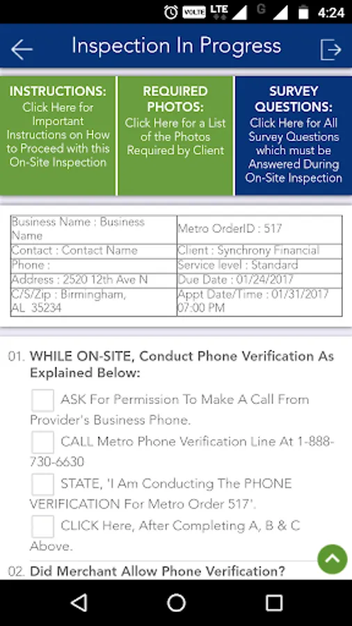 2) Mobile Site Inspection: This is the primary focus of The Metro App. It allows the inspector to“Begin Inspection” and then go through the established process based on what has been requested by the client. In other words, once the inspector begins the inspection, it gives them step-by-step instructions to follow, asks the appropriate questions and prompts the inspector to take the appropriate photographs. Metro Inspections’ servers captures the answers to the questions and uploads the photos in real time as the inspection is taking place. This includes “back” “forward” “skip” and“review” features. The “back” feature is intended to allow an inspector to go back to previous questions if they realize they answered a question incorrectly or learn new information that may change a previous answer later in the inspection process. The “forward” is meant to catch back up to where they were in the inspection before having used the “back” feature. The “skip” feature is for questions or photos that may need to come later in the inspection process than where they are originally placed. If there are photos that are unavailable or questions that can’t be answered, there is an N/A option. Once all of the required photos and questions are entered, there is a review page to make sure the inspector is happy with the answers to the questions and quality of the photos provided. Once the inspector is ready to submit the order, there is a feature where the inspector can sign the device on the screen with their finger and also have the on-site contact sign the device with their finger. Once this is all complete, the data is entered in to an editable form for our quality review process to take place.