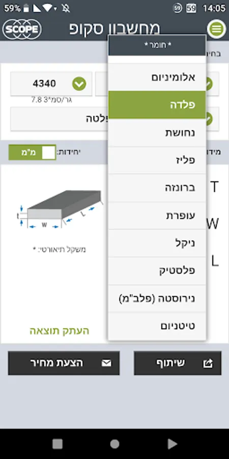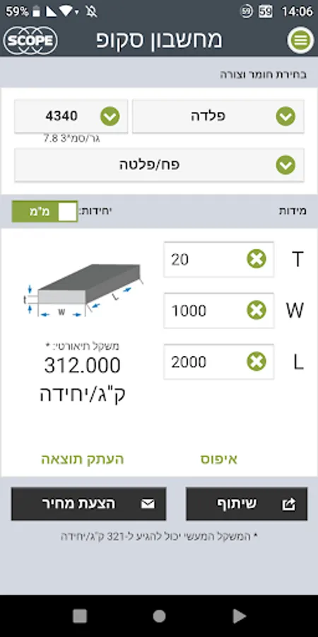 The Scope Calculator is a FREE and unlimited application for estimating the theoretical weight of metal & plastic products according to their type, density and shape and for sending RFQ's for materials based on results provided or on a stand-alone basis.Its simple - Choose material, type and shape – Obtain theoretical weight – Send RFQ