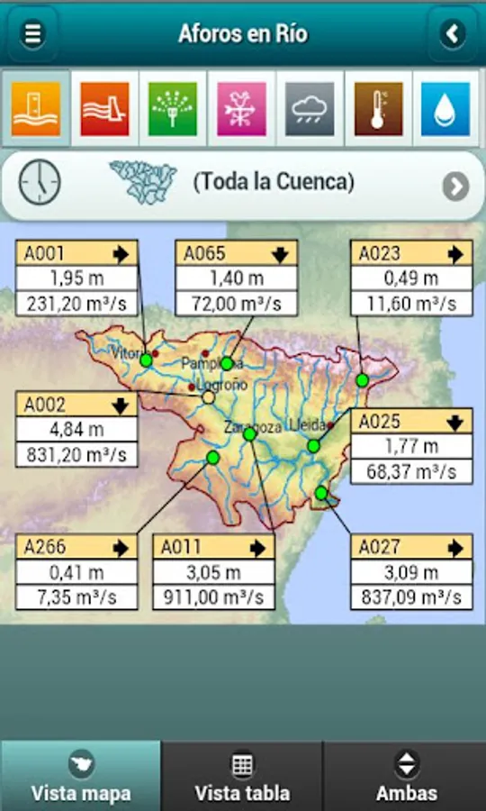 The Ebro Basin Authority supplies the SAIH Ebro application which provides real time data about the hydrological Ebro basin situation.