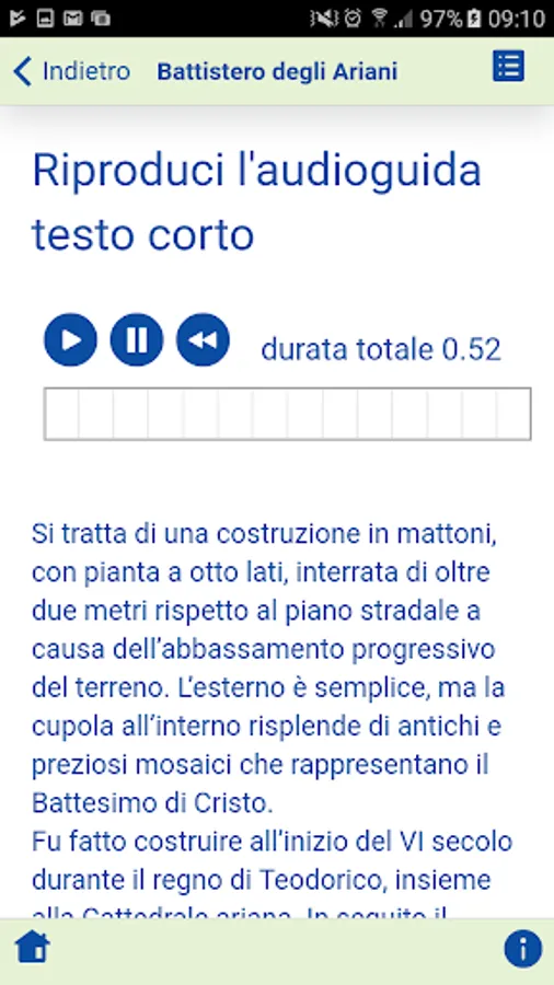 Audioguide to the Unesco monuments of Ravenna: Arian Baptistery, Neonian Baptistery, Mausoleum of Galla Placidia, Archiepiscopal Chapel, Basilica of Sant'Apollinare in Classe, Mausoleum of Theodoric, Basilica of San Vitale, Basilica of Sant'Apollinare Nuovo.