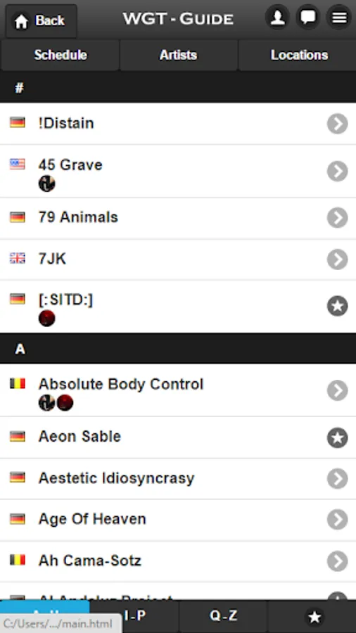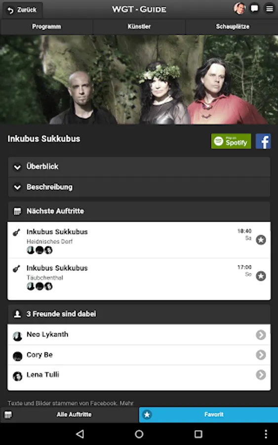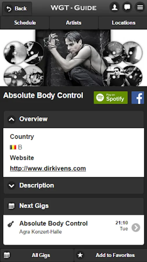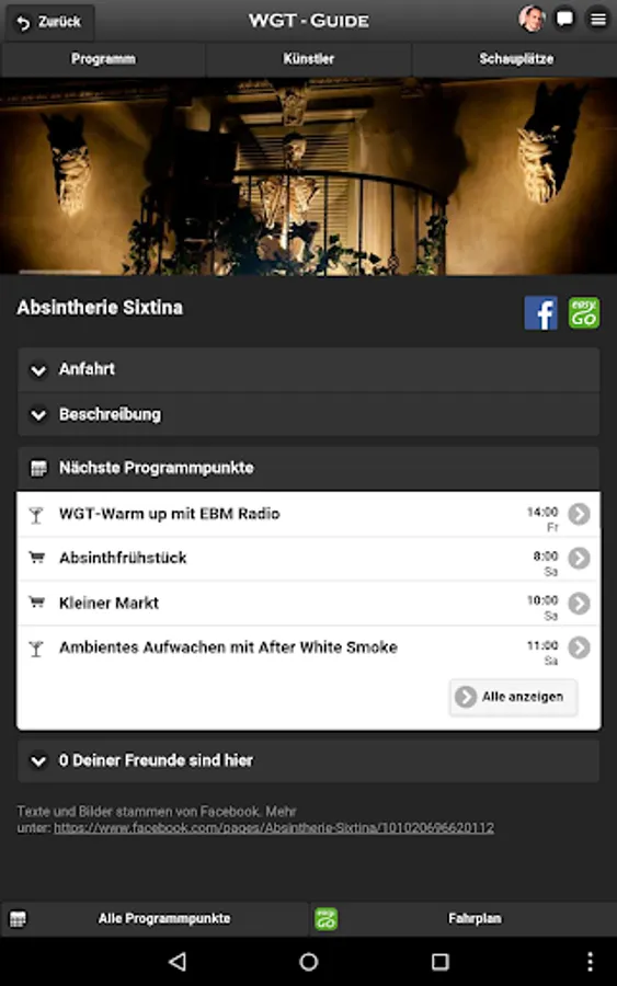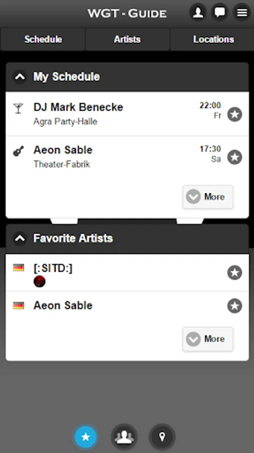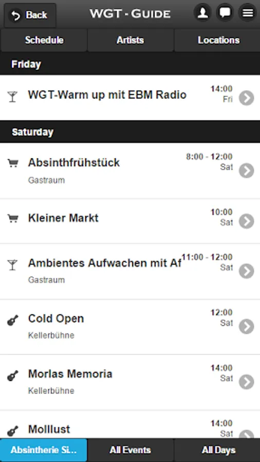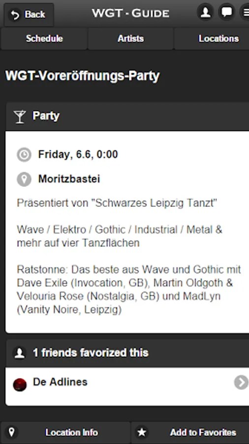 Besides the complete WGT schedule* the app features a list of all participating artists including additional information. By adding artists and events to your favorites WGT-Guide lets you create your personal WGT schedule.