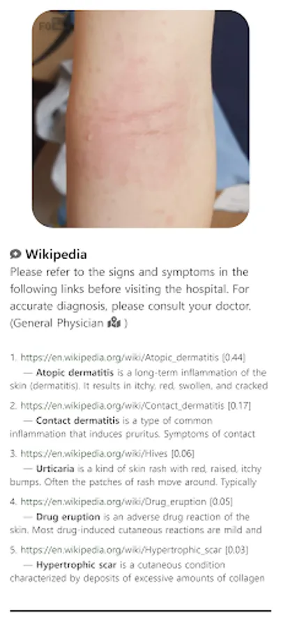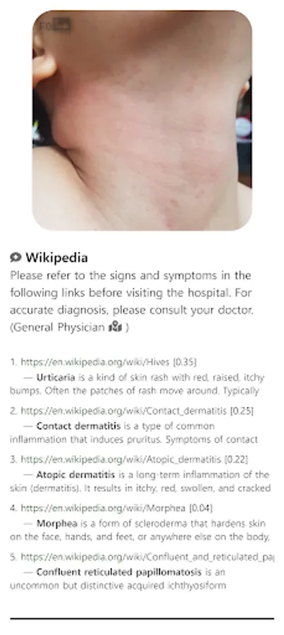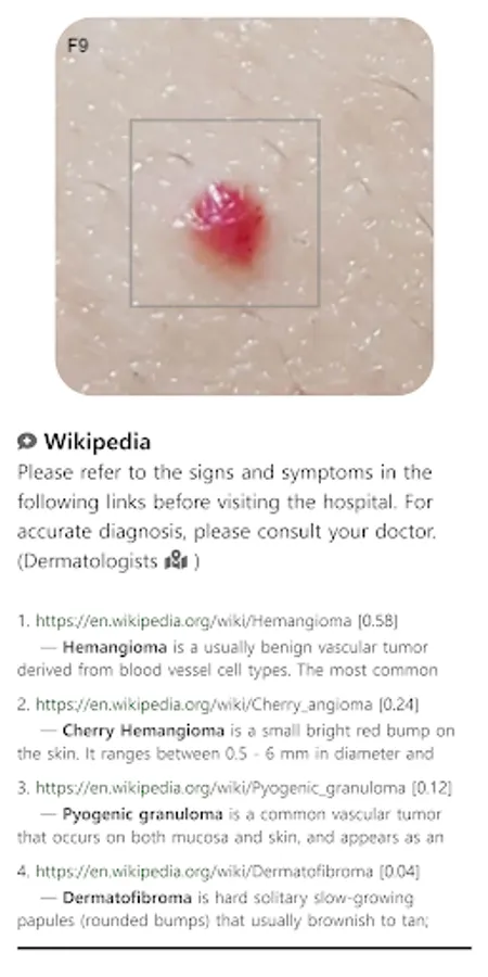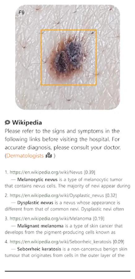 Artificial intelligence can analyze the provided photograph and instantly help to find medical information for your skin problem. The algorithm offers relevant medical information on skin diseases (e.g. wart, shingles), skin cancer (e.g. melanoma), and other skin rashes (e.g. hive).