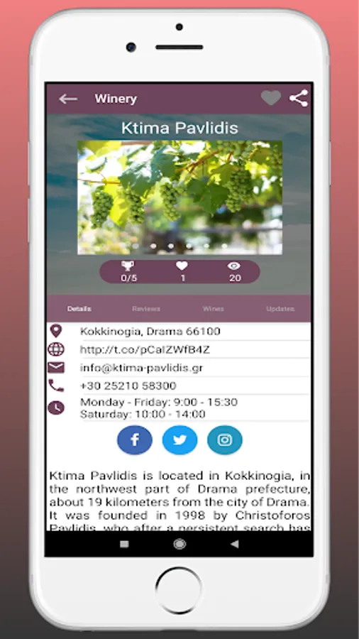 - view thousands of wineries with contact information, availability for visitors, social media pages, products' descriptions and events organized