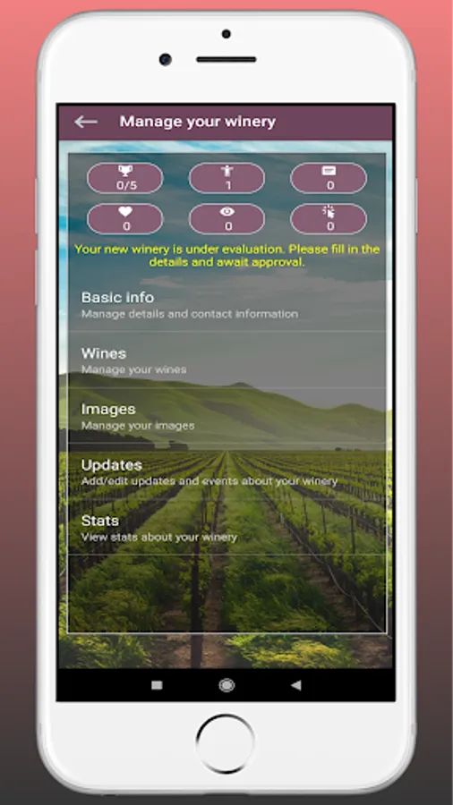 - view analytics of their winery's page about views, likes, reviews and website clicks through the app