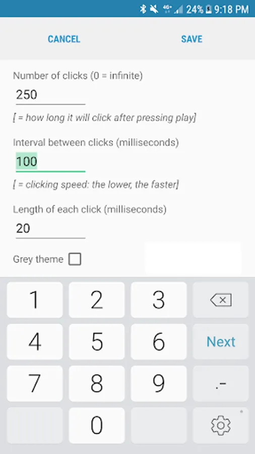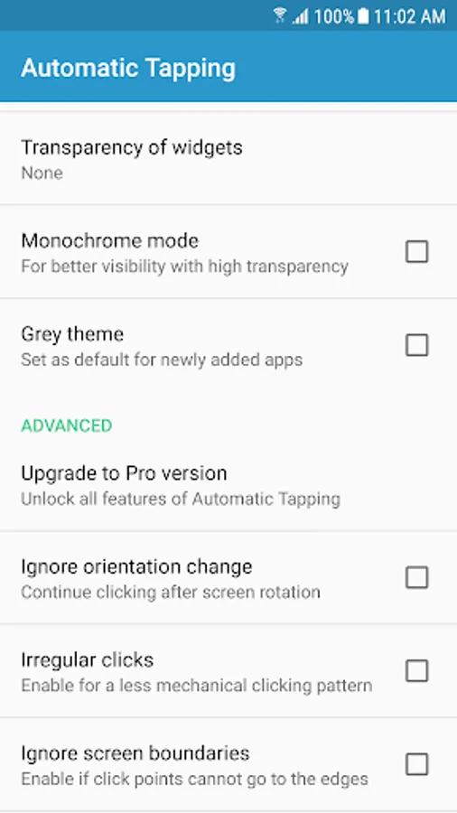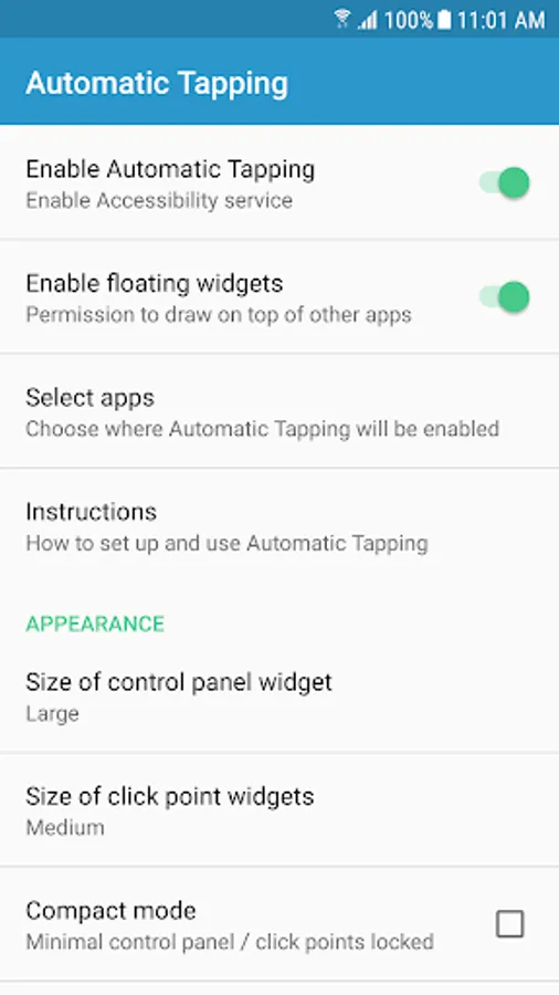 Automatic Tapping features a floating control panel for easy control of the automatic clicking. Have the panel automatically appear in your selected apps, and be hidden in all others. Conveniently select the location for the auto click via separate click point widgets. Set the clicking speed, number of clicks and click length directly from the control panel. The location of the clicks will be saved for each app, as also the selected click interval and number of clicks.