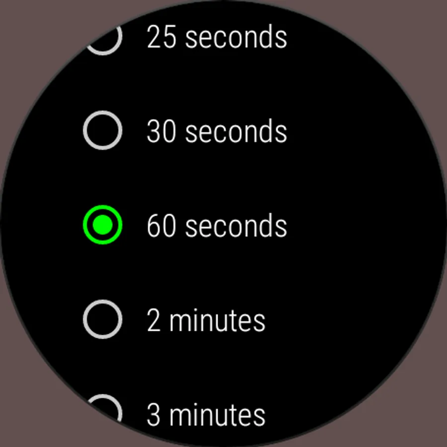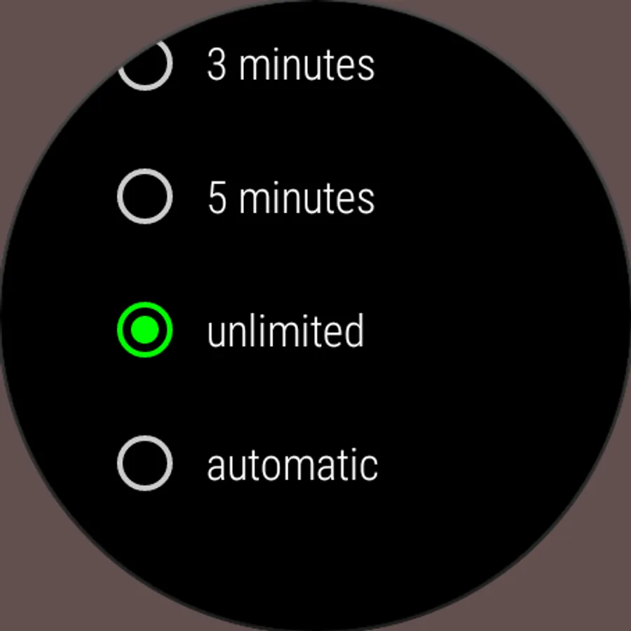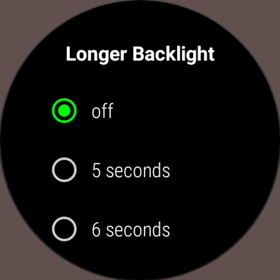 StayLit Wear lets you keep the light on for as long as you want - also for more than 30 seconds: 1 minute, 2 minutes, 3 minutes, 5 minutes, or unlimited until you switch the display off. StayLit offers a fine-grained scale for values between 5 seconds and 30 seconds.