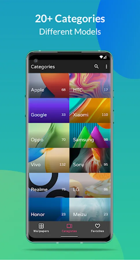 25+ Categories - With this app, you can explore wallpapers from 25+ different categories/brands. This section has wallpapers from every popular smartphone OEM’s like Apple, Samsung, OnePlus, LG, Huawei, Xiaomi, Realme, Motorola, Lava, Micromax etc.