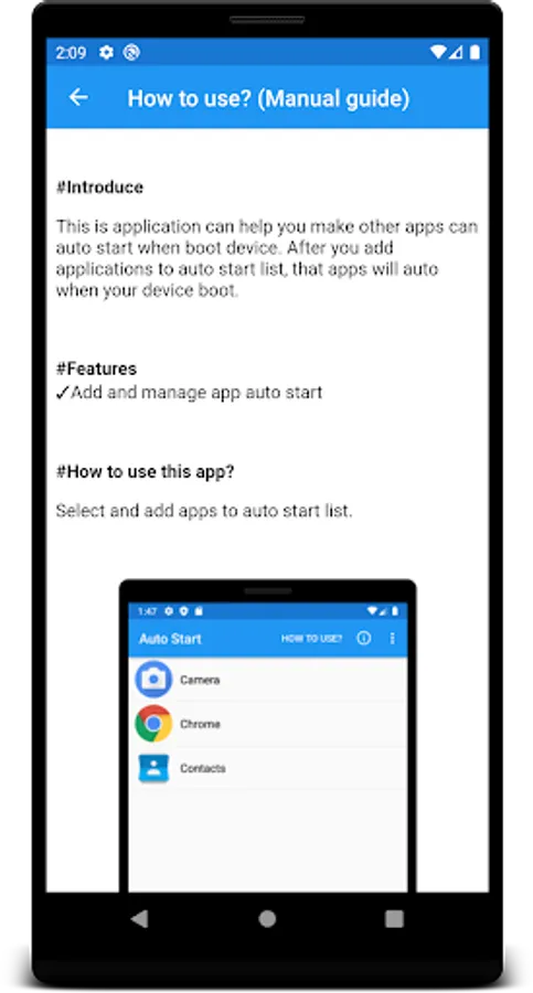 This is application can help you make other apps can auto start when boot device. After you add applications to auto start list, that apps will auto when your device boot.