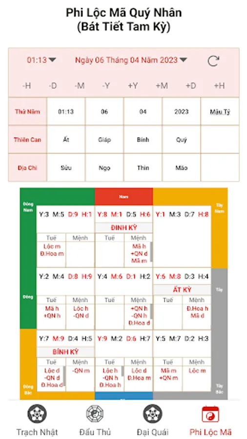 Phi palace gods follow the year and month (the gods such as Phi Thien Duc Nguyet Duc, Phi Chan Loc Ma, Dai Tieu Nguyet, Mua Ky Do Thien will be included in the annual automatic calculation table)