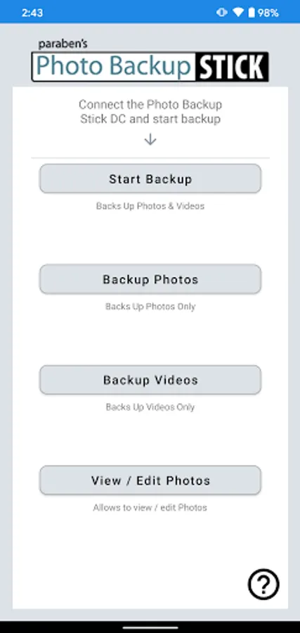 • Connect and Go – There’s no account to set up. If you have a genuine Photo Backup Stick DC for Android OTG drive, you can connect the drive and start backing up immediately…no accounts to sign up for, no product keys to enter, and the app is free.