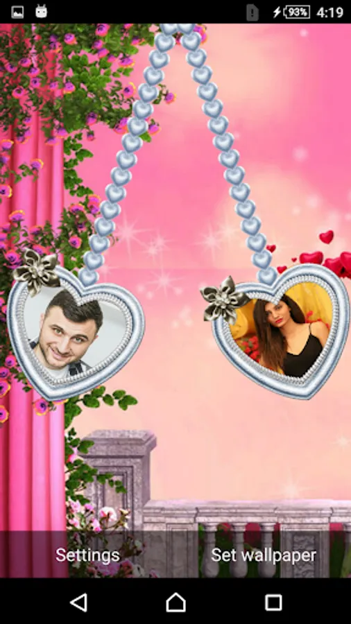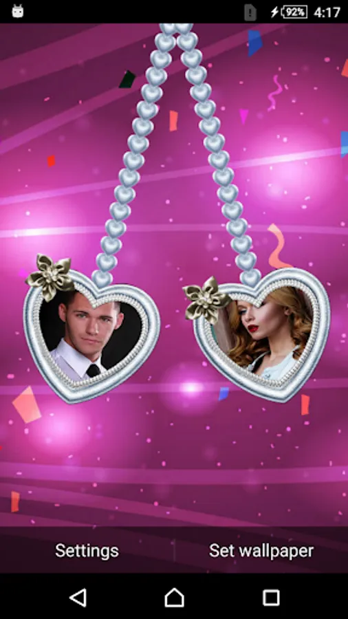 Couple photo live wallpaper app makes your Love swing like a pendulum with different backgrounds and falling hearts of rainbow colors.